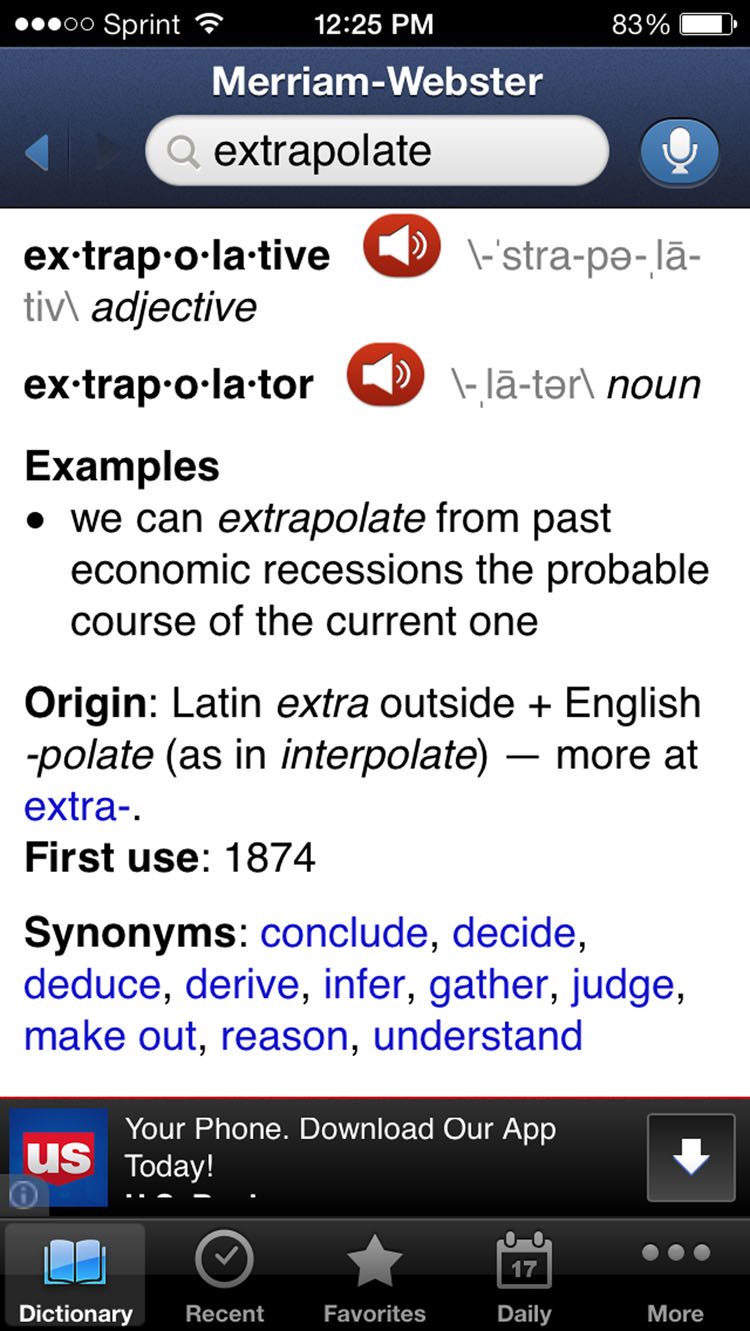 The first app is your standard dictionary provided by Merriam Webster. The MW dictionary has the least distracting ads of the dictionary apps I’ve used and provides great definitions. However if you don’t like the ads, you can upgrade to the paid version for $3.99 and get helpful illustrations and a bonus thesaurus.