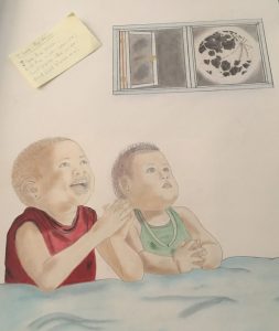 When Wallace asked what inspired Cintron, she said that her main influence came from “the beauty of children.” She explained her thoughts on what drives this idea: “there’s so much abuse out there, and I just wanted to focus on the good side of things.” She works from photos that she has taken of her children and turns those into drawings. These start out in graphite, and she puts color into them with pastels.